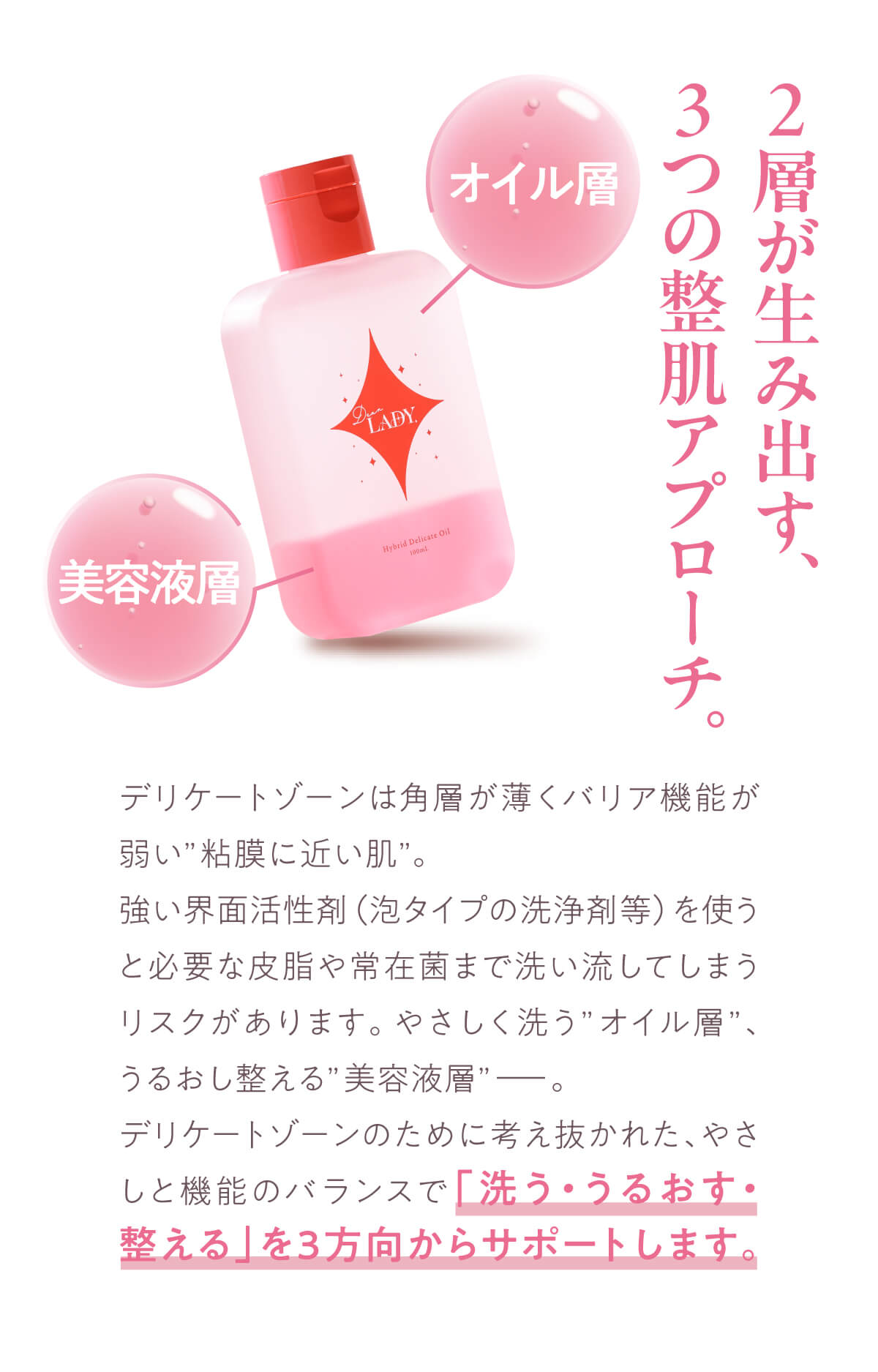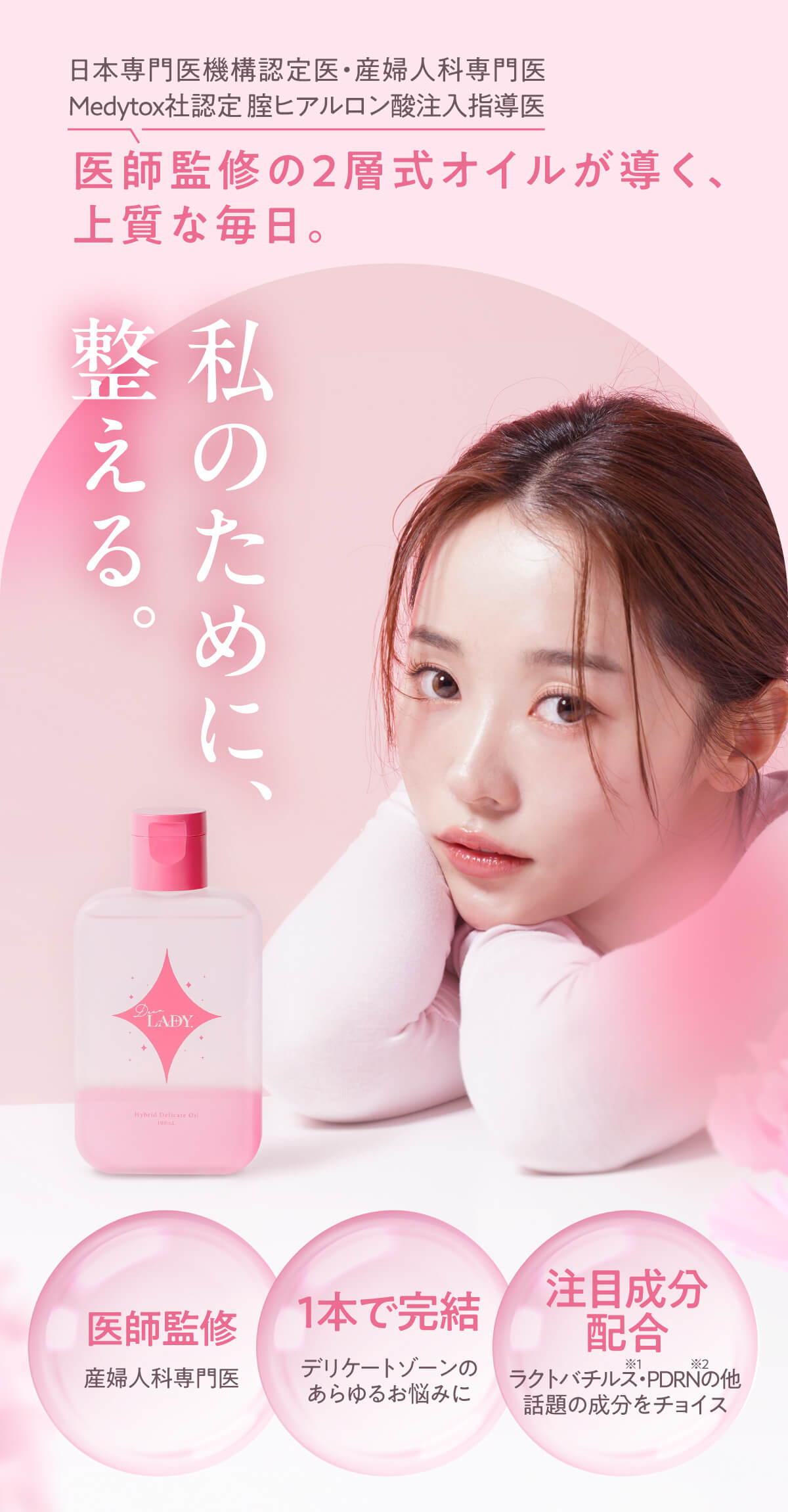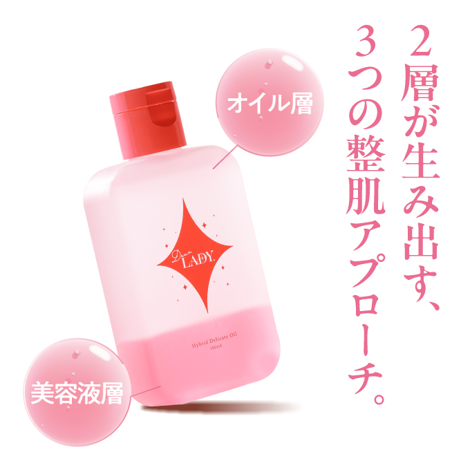 | 特徴 | 日本専門医機構認定・産婦人科専門医が監修した二層式デリケートゾーンケアオイル。 オイル層が汚れをやさしく落としながら保護し、美容液層がうるおいと透明感を与えます。美容成分には、美容医療業界で注目のPDRN(サーモンDNA)と、健やかなデリケートゾーン維持に欠かせないラクトバチルス・クリスパタス菌KT-11を配合。 “洗う・うるおす・整える”を1本で叶える、毎日安心して続けられる医師発想のデリケートケアです。 |