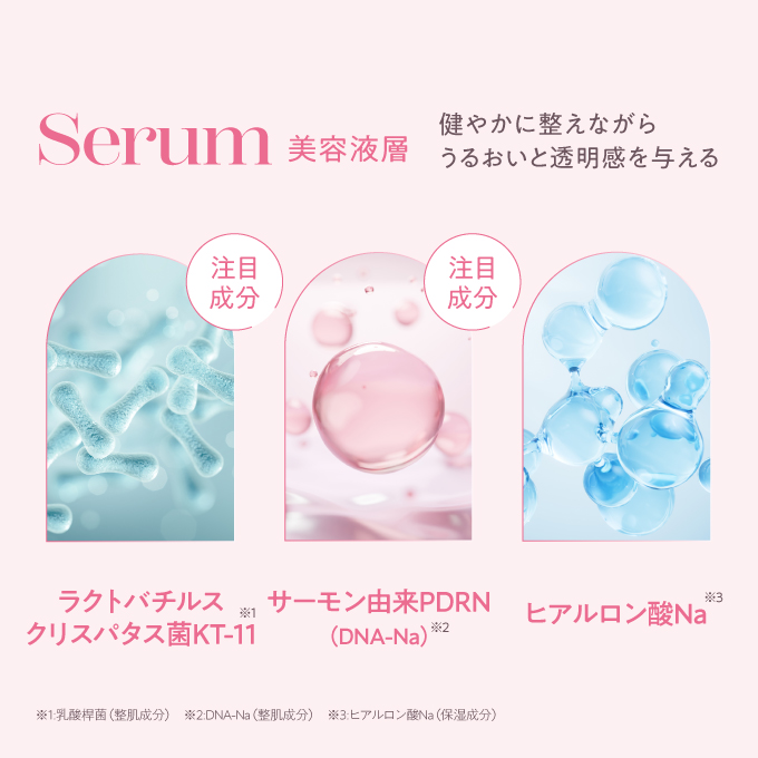 | 全成分 | スクワラン、水、トリ(カプリル酸/カプリン酸)グリセリル、ヒマワリ種子油、ホホバ種子油、トレハロース、トコフェロール、ビサボロール、DNA-Na、ヒアルロン酸Na、乳酸桿菌、グリチルレチン酸ステアリル、シアノコバラミン、塩化Na、1,2-ヘキサンジオール、フェノキシエタノール |
